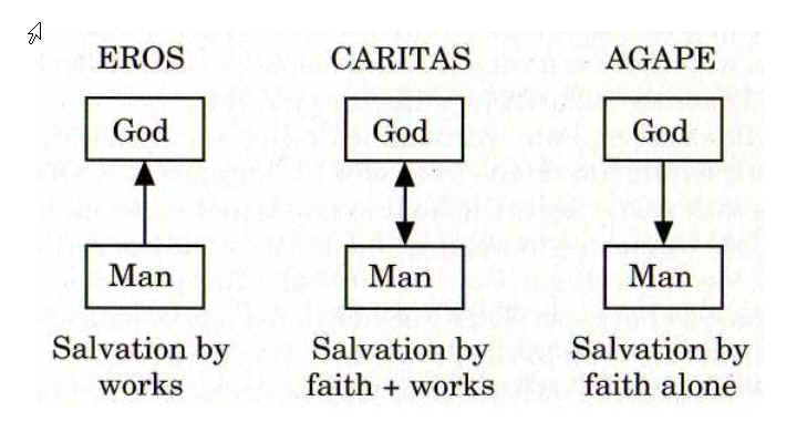 So we see that there are three concepts of love: eros, or self-love; agape, or self-sacrificing love; and caritas, which is a mixture of self-love and self-sacrificing love. Each of these concepts of love has produced its own gospel.
