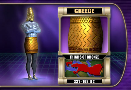 The belly and thighs of bronze symbolize the kingdom of Greece, which overthrew the Persians at the Battle of Arbela in 331 B.C. Alexander the Great conquered the Medes and the Persians, turning Greece into the worlds third great empire. She ruled from 331 to 168 B.C. |