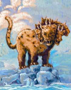 fangs like a lion. It displays seven heads and ten horns as it arises,