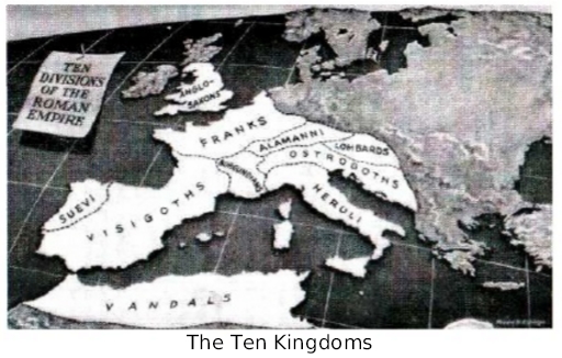 We have already seen that the fourth kingdom, corresponding to the legs of iron of the image, was the kingdom of pagan Rome. Between the years 351 A.D. and 476 A.D. the empire of Rome was invaded by heathen tribes from the North. Ten smaller kingdoms sprang up out of the ruins of pagan Rome.