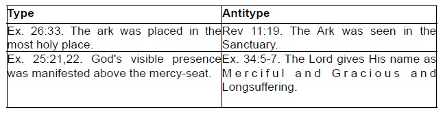 The cover of the ark was called the mercy-seat, and was of pure gold. On either end of the mercy-seat were cherubim of beaten gold, with their wings stretched forth covering the ark, and their faces looking reverently toward the law of God contained therein.