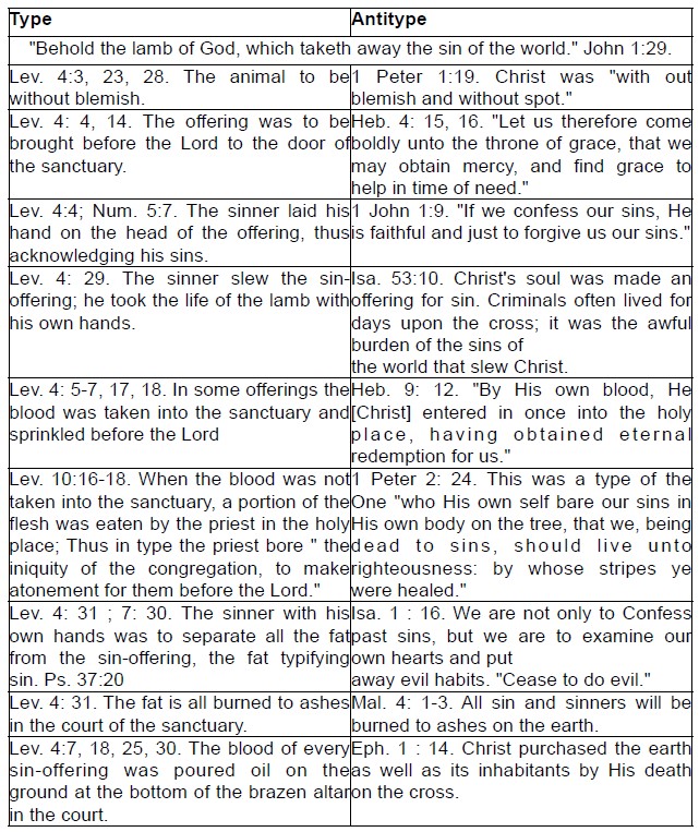 The sinner, by confessing his sins over the lamb, in type and shadow transferred them to the lamb. The life of the lamb was then taken instead of the life of the sinner, typifying the death of the Lamb of God, who would offer his life for the sins of the world. The blood of the animal was powerless to remove sin, (Hebrews 10:4) but by shedding its blood the penitent revealed his faith in the divine offering of the Son of God. Every sin-offering was to be without blemish, thus typifying the perfect sacrifice of the Saviour. (1 Peter 1:19)