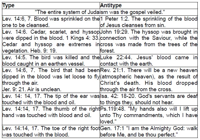 This service was not an empty form, but a type of a blessed antitype, which is fulfilled in every Christian who presents himself for service before the Lord, after the Lord forgives his sins and pronounces him clean. Of Mary, Jesus said, "Her sins, which are many, are forgiven; for she loved much: but to whom little is forgiven, the same loveth little." (Luke 7:47) The leper cleansed from that loathsome, living death, felt so thankful to God for freedom and cleansing that he consecrated his life to the Lord for service. Not only is the oil, an emblem of the Holy Spirit which prepares the Christian for service, touched to his car, hand, and foot, but it is poured upon his head, thus betokening a full surrender of the entire being to the service of His Master who has redeemed him. The books of heaven record the names of many who have fulfilled this beautiful antitype by surrendering their entire being to the service of their Redeemer.