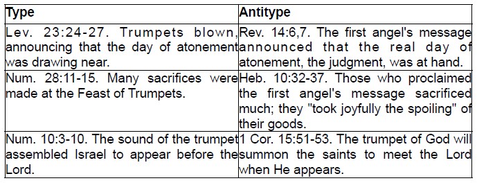 It is quite evident that, like the Passover, the Feast of Trumpets was both commemorative and typical. It came on days before the day of atonement, the type of the great investigative judgment which opened in 1844, at the end of the long, prophetic period of the twenty-three hundred years of Dan. 8:14.