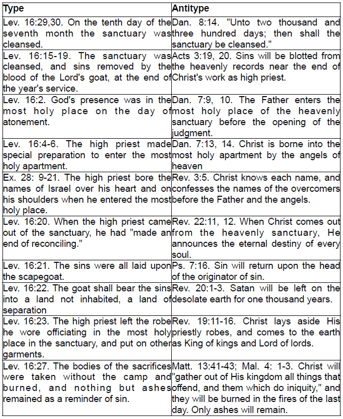 In the type, after the high priest had finished the work within the sanctuary on the day of atonement, he came forth bearing the sins of all Israel, and placed them upon the head of the scapegoat. The scapegoat had no part in reconciling the people to God. The work of reconciling was all ended (Leviticus 16:20) when the scapegoat was brought forward to act his part in the service. The only work of the scapegoat is to act as a vehicle to carry the sins of the righteous into the "land of separation."