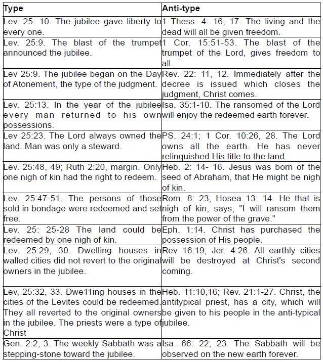 The Day of Atonement was the most solemn of all the feasts, and the Jubilee the most joyful. At the close of the Day of Atonement, when the sins of Israel had all been forgiven and borne by the scapegoat into the wilderness, then the people who realized what God had done for them, were prepared to forgive the debts of their fellow men, to release them from servitude, and to restore all to their own land as willingly as they expected God to give them their eternal inheritance in the antitypical jubilee.