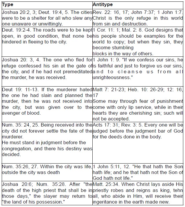 The Saviour refers to this judgment in Matt. 5:21. If at any time the slayer passed outside of the limit of his city of refuge, his life could be taken by the avenger of blood, "because he should have remained in the city of his refuge." (Num. 35:26-28) The decree was, "He shall dwell in that city until the death of the high priest that shall be in those days: then shall the slayer return unto his own house, unto the city from whence he fled." (Joshua 20:6) Cities of refuge in Israel were far different from the asyla of the Greeks and Romans, which often served as a protection for the most profligate characters. The cities of refuge served as a protection for only those who had slain a person without enmity. The cities of refuge were cities belonging to the Levites, thus those confined within were under the best influence. They were associated with the religious teachers of Israel, and had every opportunity to reform their lives and establish righteous characters.