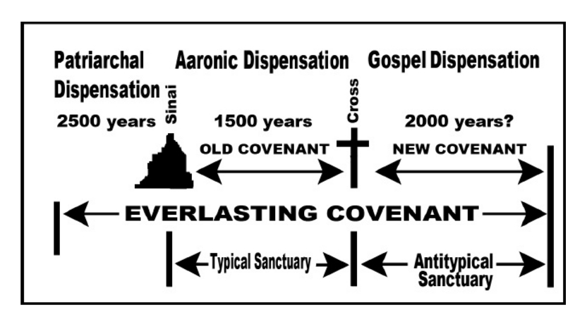 Here is a diagram of the covenants as we have taught it more than a hundred years. Clearly presented on the next page is the dispensational idea which has been with us for so long, in fact, as I myself taught it for many years. There is shown the Everlasting Covenant which covered the period from Eden to Sinai (Patriarchal Dispensation) 2500 years, followed by the Old Covenant which went from Sinai to the Cross, 1500 years (Aaronic Dispensation), and then finally the New Covenant which takes in the period from the Cross to the end, 2000 years (Gospel Dispensation). To diagram the covenant truth correctly we would have to show two parallel lines from Eden to the Second Coming, the one representing the New Covenant (or Everlasting Covenant) and the other the Old Covenant.