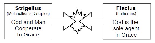 Out of this debate grew another, known as the "Synergistical" controversy, from a Greek word signifying co-operation. The disciples of Melancthon, led by Strigelius, held that man co-operates with divine grace in the work of conversion.