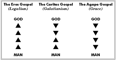 Today three concepts of love exist: the concept of eros or self-love; the concept of God's agape or self-giving love; and the concept of caritas, a mixture of self-love (eros and agape). Each of these three concepts have produced in human history their own kind of gospel. The pagans who are steeped in eros have produced in their various religions the gospel of works. As Aristotle, the great Greek philosopher, declared: "Salvation is the movement of the creature towards God." Plato taught a similar idea, and believed that God only saves the lovable. In other words, the eros gospel teaches that man must save himself by pleasing God through sacrifices and good works, to make himself lovable. We call this "legalism" or salvation by works, the basis of all non-Christian religions.