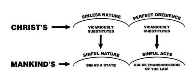 According to the vicarious view of substitution, Christ's sinless human nature was substituted in the place of mankind's sinful nature. His perfect obedience and His sacrificial death, were substituted in the place of the sins of the human race. Such a view presents Christ as a Substitute who does not truly identify Himself with the sinful human race He came to redeem. He does not become one with us; instead, He substitutes His sinless nature in the place of our sinful natures. The following diagram illustrates how the vicarious view of substitution redeems us from the twofold problem of sin— sin as a state, and sin as transgression of the law: